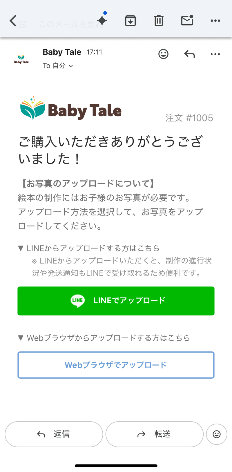 メール内に「LINEでアップロード」と「Webブラウザでアップロード」のボタンがございますので、どちらかを選択してアップロード作業に進んでください。