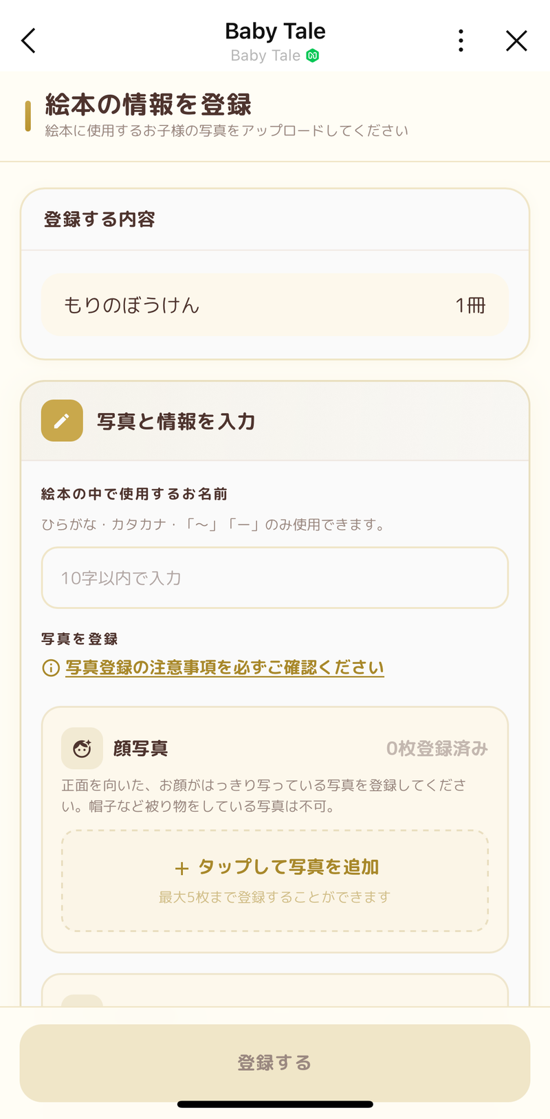 アプリ内の指示に従ってお子さまの基本情報、顔写真・服装写真をアップロードします。